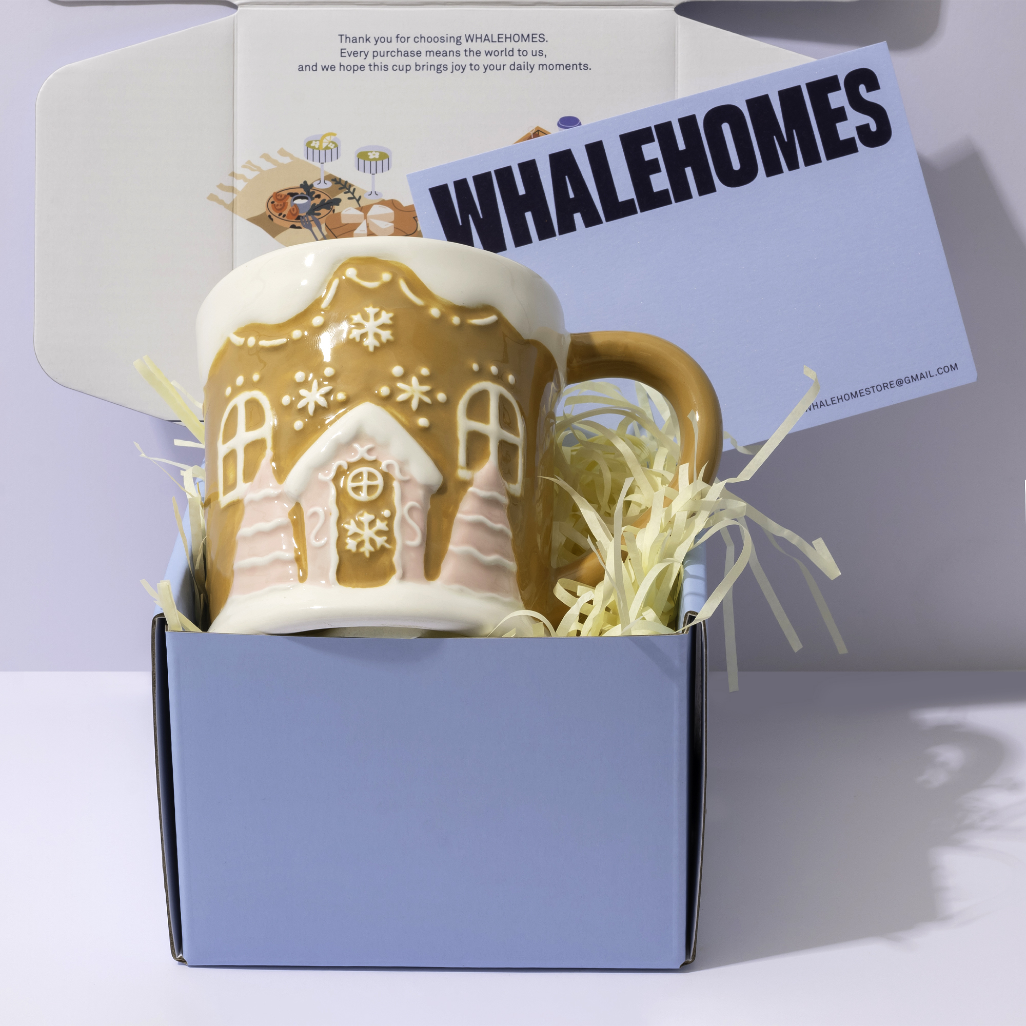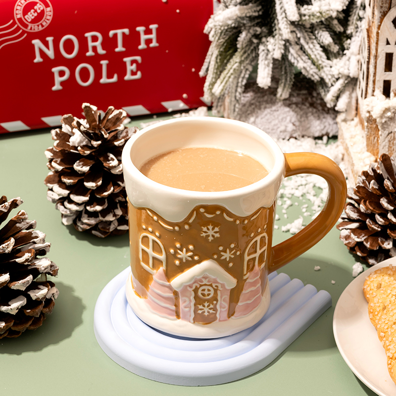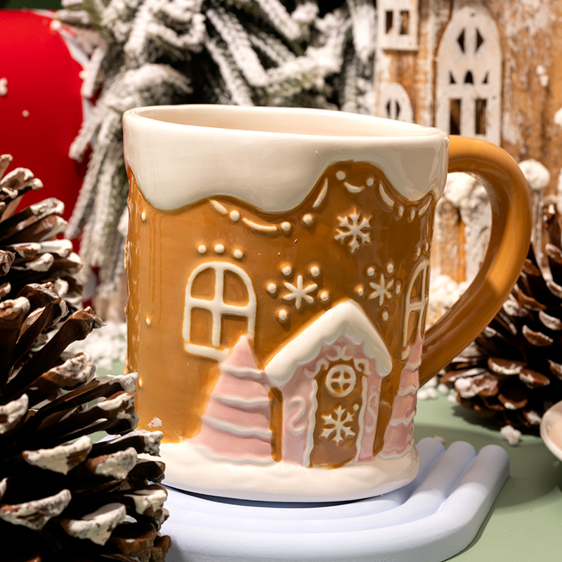 Christmas Gingerbread House Ceramic Mug Add a cozy and festive touch to your mornings with our Holiday Gingerbread House Ceramic Mug! Perfect for sipping hot cocoa, coffee, or tea during the holiday season, this beautifully designed mug features a whimsical 3D gingerbread house complete with snowflakes, frosted rooftop, and charming pink Christmas trees.