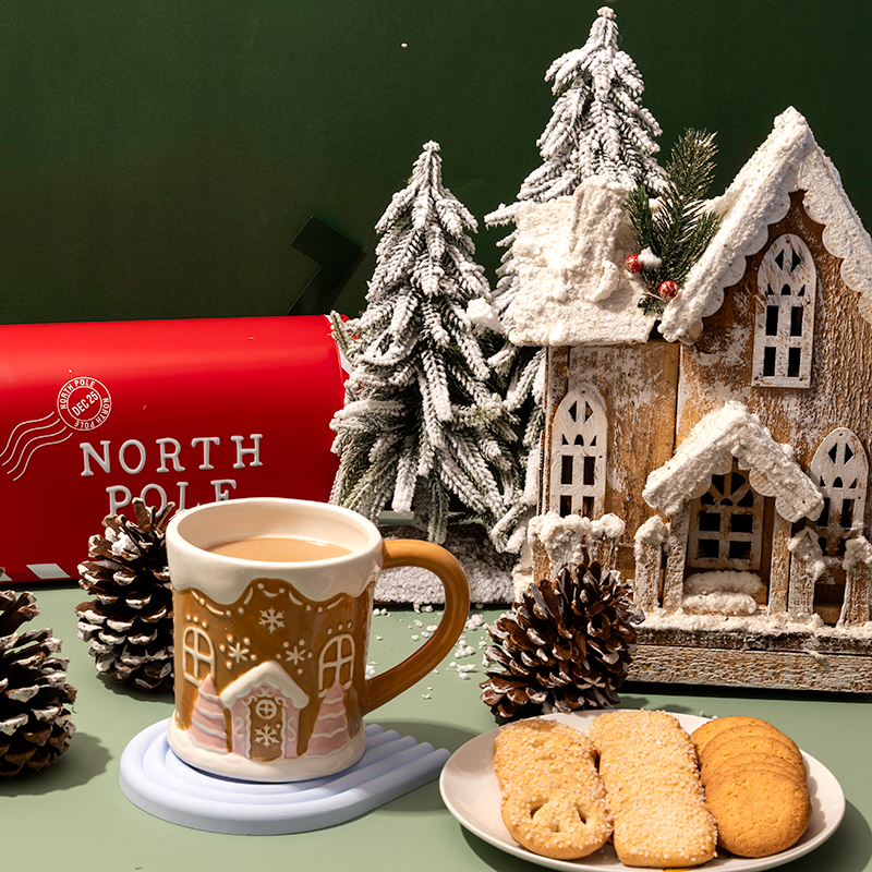 The mug is shaped and painted to resemble a cozy gingerbread house, complete with detailed windows, snowy icing edges, and holiday trees. It brings warm, festive vibes to any kitchen or office desk.