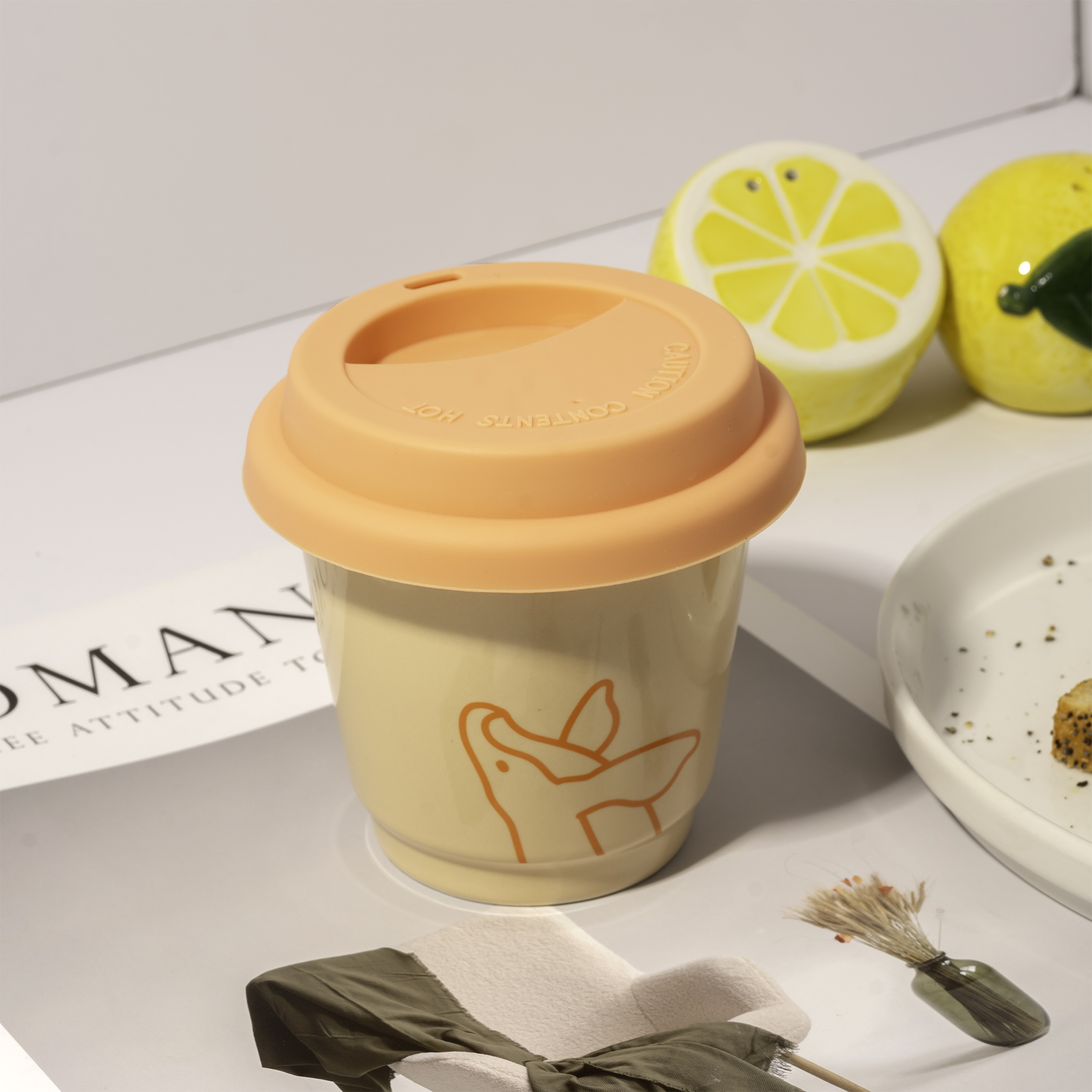 This cute coffee mug with lid is designed to bring charm and personality to everyday coffee moments. Inspired by the familiar shape of takeaway coffee cups, the mug transforms a classic café design into a reusable ceramic cup with a playful and aesthetic appearance.