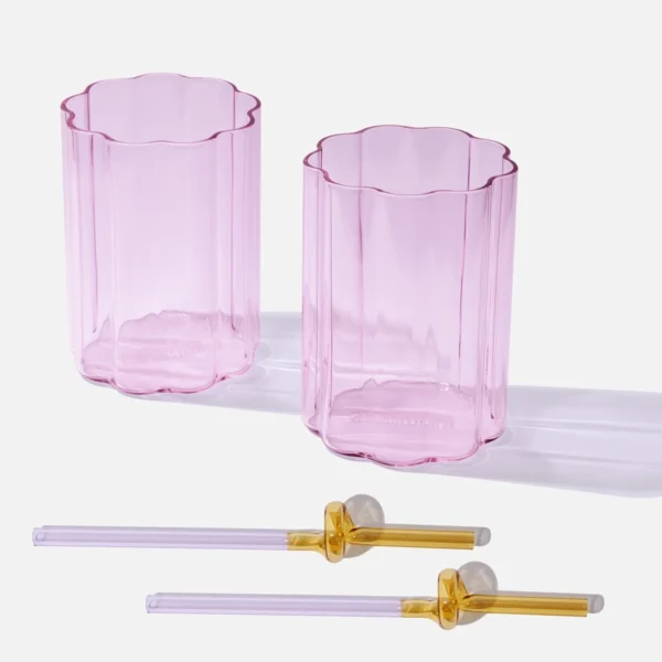 Pink Ripple Glass cup x 2 with Straws